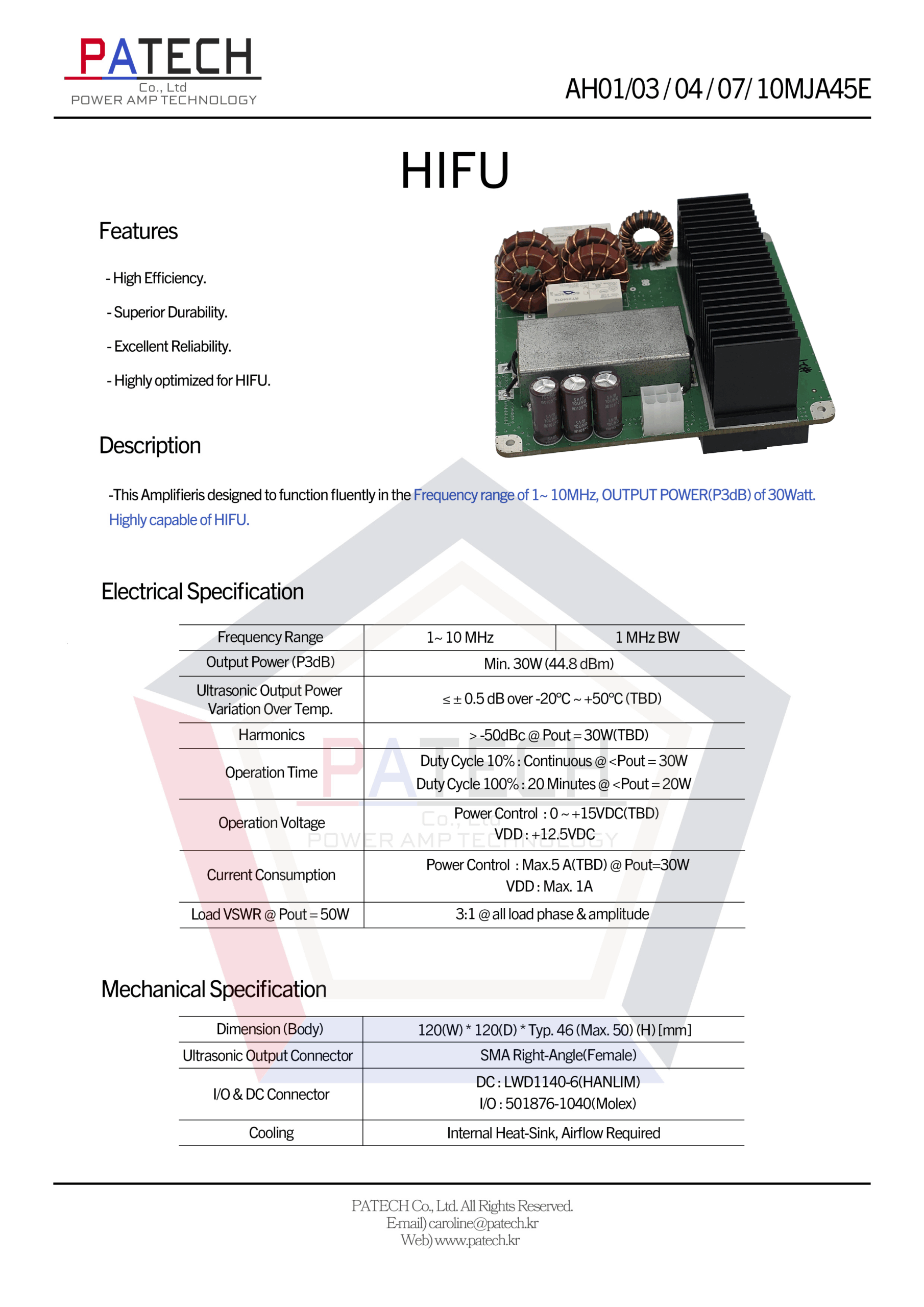 Medical FrequencyOutput PowerVoltageCurrentDimensionCatalogue 1~10 MHzMin. 30W0~+15VDC VDD:+12.5VDCMax. 5A VDD: Max1A120*120*Typ.46(Max. 50)Open 20~100 kHzMin. 30W0~+15VDC VDD:+12.5VDCMax. 5A VDD: Max1A120*120*Typ.46(Max. 50)Open